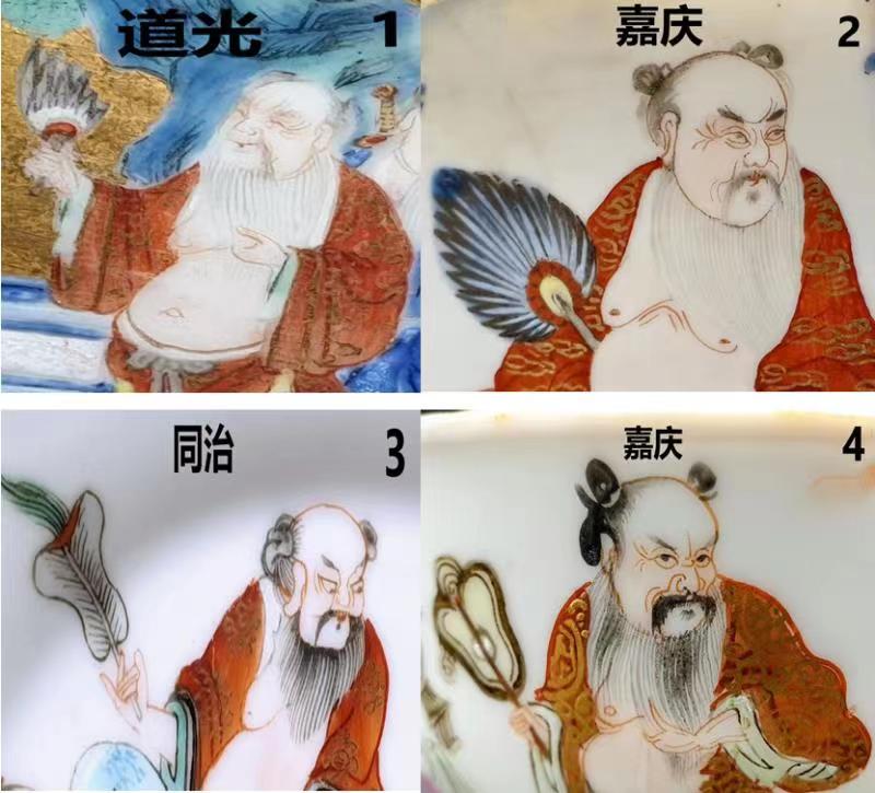说一下当时本人竞猜路径,首先 排除了康雍乾、光绪民国及建国后,理由是(对不对,请高手指点):粉彩创烧于康、兴于雍,盛于乾隆。三朝的特点非常突出,竞猜的图片画工上与这三朝有比较大差距;光绪民国 建国后的红彩和图片的差别也大,也是比较容易排除的。首先确定的是图一道光图二嘉庆,这点从本人给出的两次答案可以证实。图三图四,第一次的回答是咸丰、同治,截止时间是十二点,当时忙,没有仔细对比,十二点整,把答案发群里。后来细看并查资料对比,确定图四是嘉庆。剩下图三,在咸丰 、同治之间摇摆,问了藏家朋友,朋友说:嘉道 咸同,非官窑典型器,一般不分家,有全图可以明确。于是也没有再找明确的标准器图片对比,所以就选了咸丰。