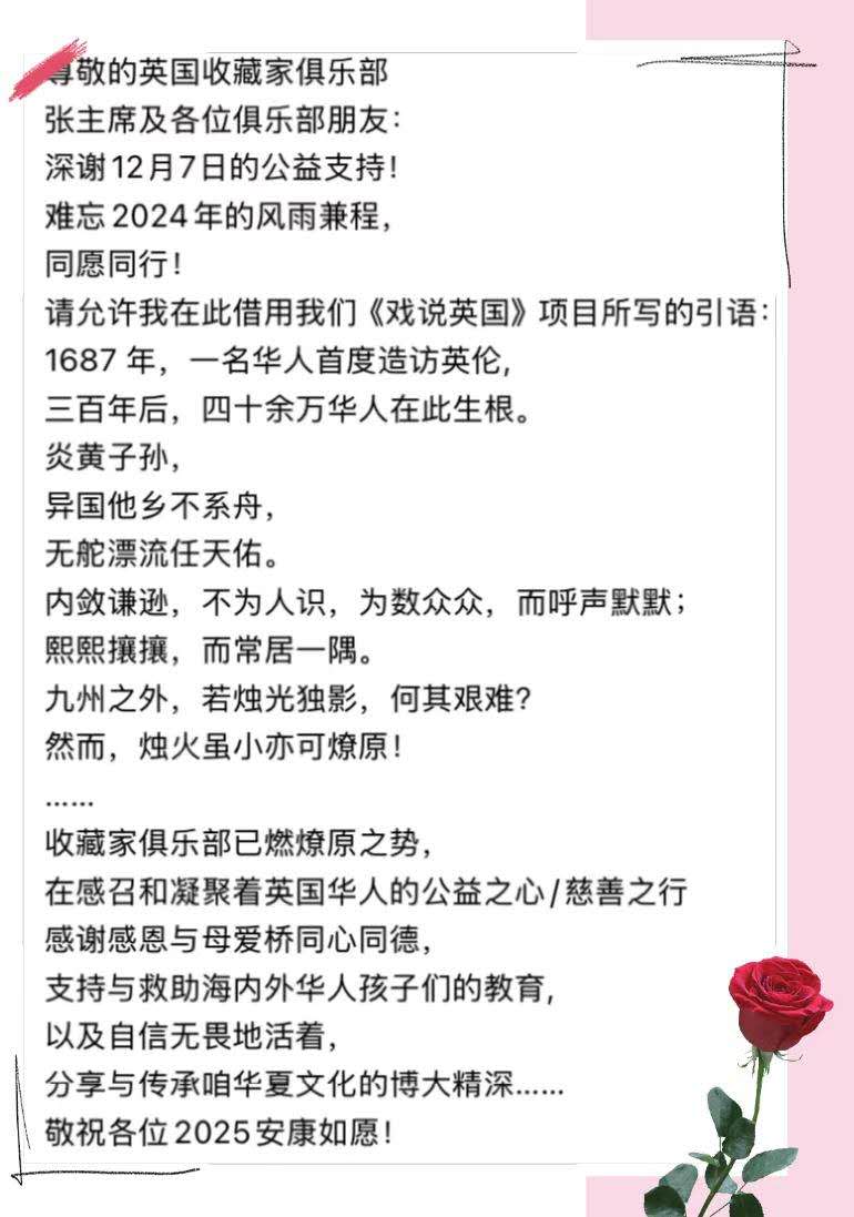 2024年12月7日,我们英国华人收藏家俱乐部,在伦敦泰晤士河边的“孔雀临江宴”,举办了一场迎新年酒会 + 聚餐,嘉宾云集,高朋满座。在古琴、竖琴美妙的音乐声中,欢聚一堂。