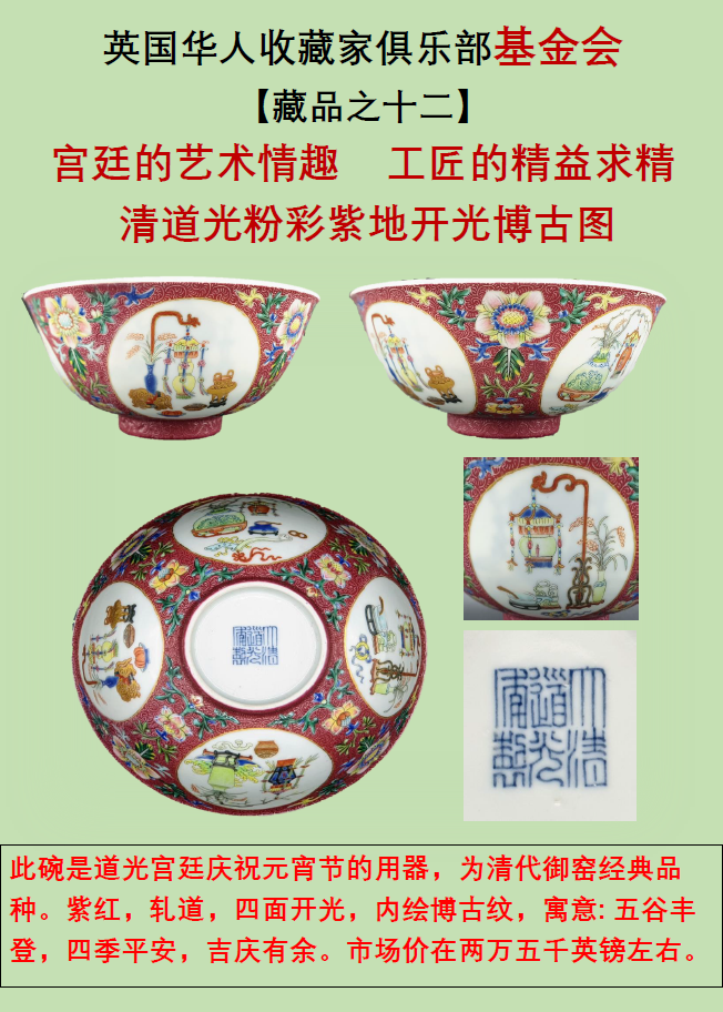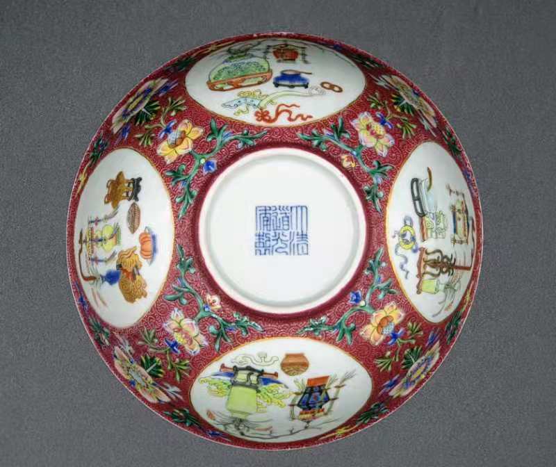 清道光粉彩紫地开光博古图碗【藏品十二】