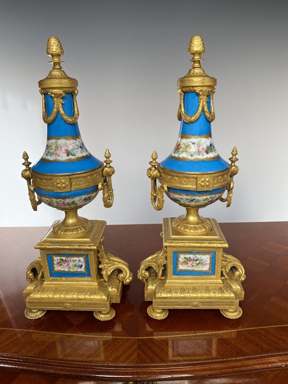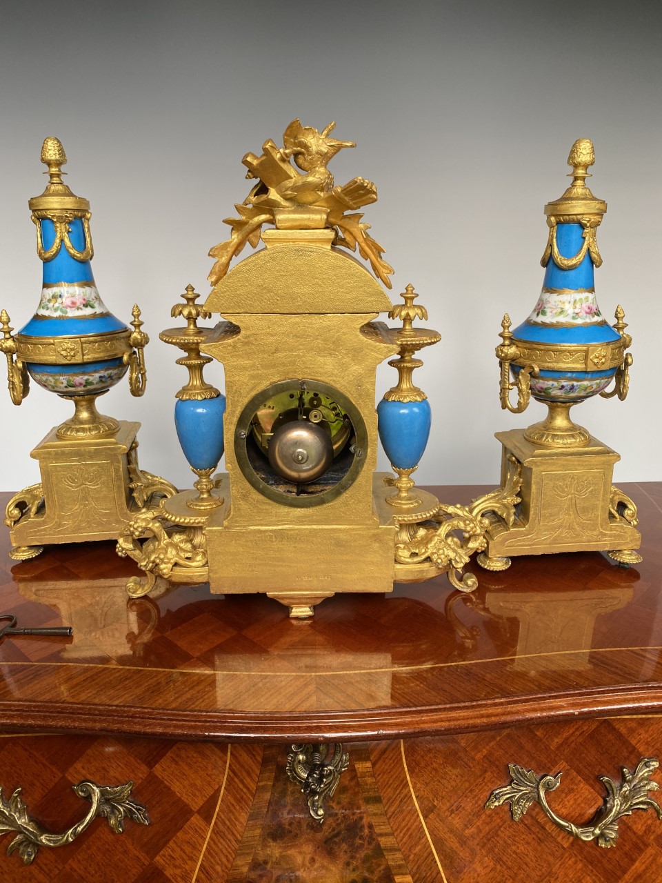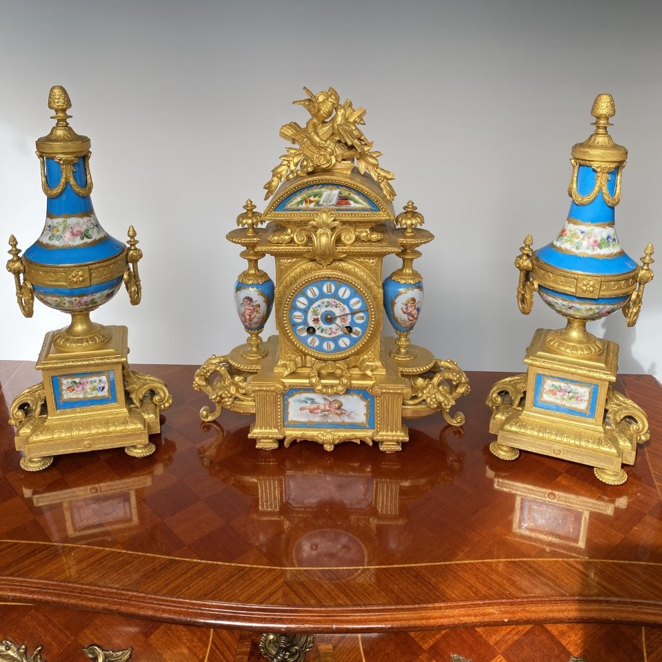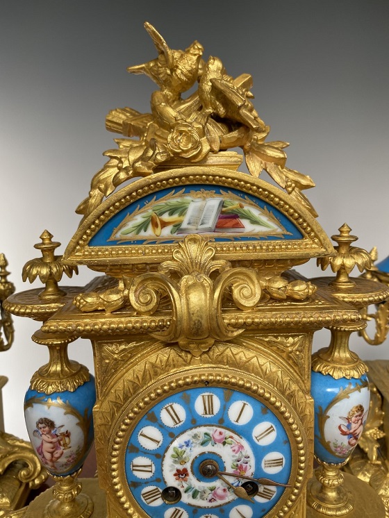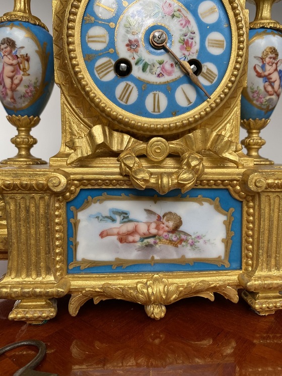 这个难得的三件套法国古董座钟,具有最著名的原始的Severe陶瓷各种造型的彩绘,以天使花卉为主,镶嵌于特殊定制的铜鎏金机座。铜钟座则以相应的天使,花卉,奖杯,等雕塑铸造而成。机芯出自获金奖的法国古董钟表机芯制作大师Japy Ferre. 机芯号,制作大师印章,均刻于机芯的后铜板上。基座与花卉亦出自名家之手,机体与瓷板后均匀作者签名。好马配好鞍,瓷板画,铜雕塑机壳,机芯,三者均为当时法国业内翘楚的名家联合订制打造。难得的珍品。详细情况与更多图片请联系我们。