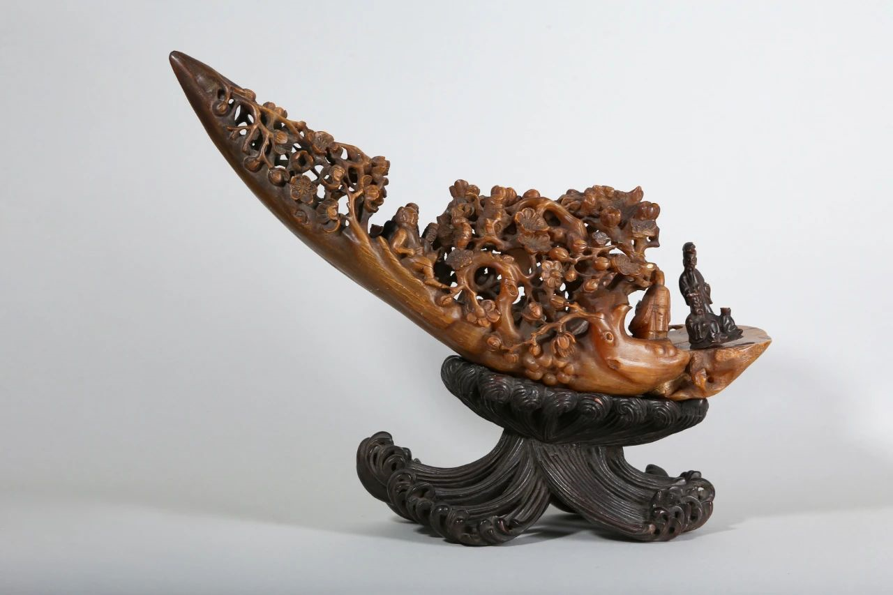 65号 清十九世纪犀角雕仙人乘槎摆件连木座