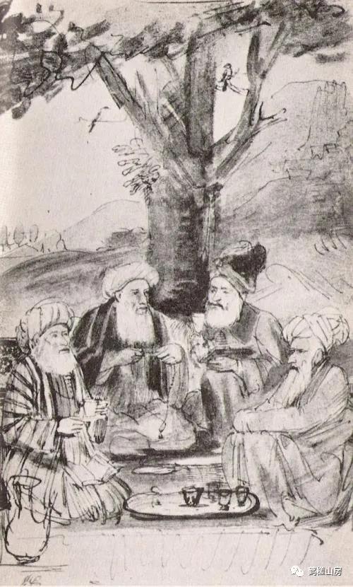 伦勃朗1656年—1661年《坐在树下的四位毛拉》纸本墨水,这件题材模稿虽然有印度细密画的风格(细密画也是深受中国画影响的一种绘画艺术),但整体风格具有显著的中国“克拉克瓷器”的构图特征。
