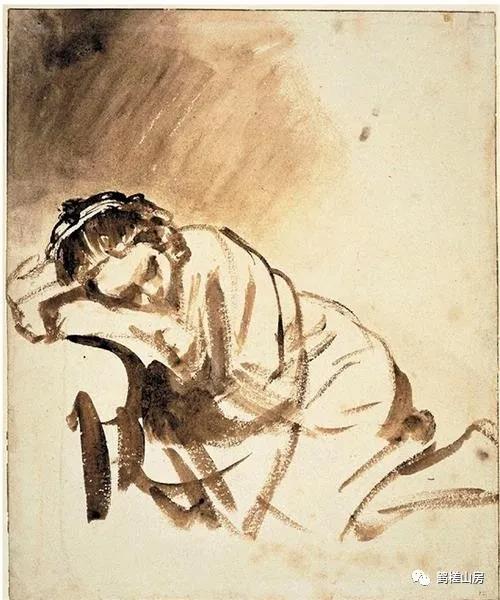 第二幅伦勃朗1655年的《睡觉的女孩》,纸本褐彩,用的就是“铁樱墨水”(中国水墨),这个其实就是中国的水墨的简笔画法。其源头基本可以确定为当时风靡荷兰的克拉克青花瓷器上的图案和绘画技法,这种技法以前在欧洲传统中从来没见过,伦勃朗人物素描的笔意恰恰饱含了这种中国风尚。从纯画技来说,牛津大学中国美术史教授迈克尔.苏利文研究认为,伦勃朗这种“简略法”,只能在中国出口到欧洲的青花瓷器上才能找到范本。