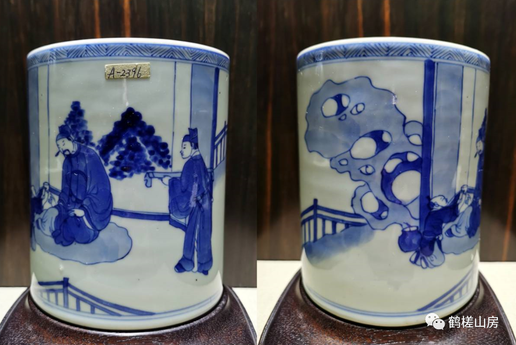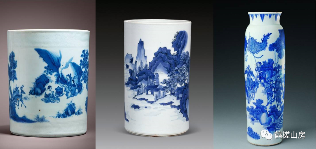 (同一康熙笔筒上石头画法同时具有风格强烈的“米芾皴”和“大孔洞”出现,时代特征强烈)