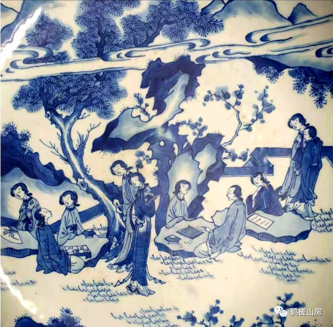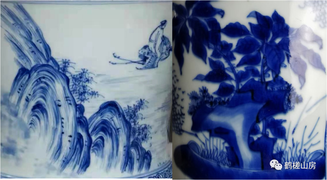 康熙时期有一种斧劈皱的分水画法,成为了康熙一朝所特有的标志性的风格,成为了铁一样的标识特征。而且这类“石头”画法往往和青花“翠毛蓝”的发色紧紧结合在一起,成为了康熙一朝一个有趣的现象。康熙“石头”画法还有就是那种“大孔洞”的画法也很普遍,只是通过青花浓淡变化而有了立体感,“米芾皴”、“长披麻”(铁线描)也是康熙瓷器上“石头”纹饰的显著特征,鉴定参考度很高。康熙一朝,如果不是清仿明的器物,明代“石头”的各种画法已经基本消失不见了,清代一朝的特征已经形成了自己的特点。