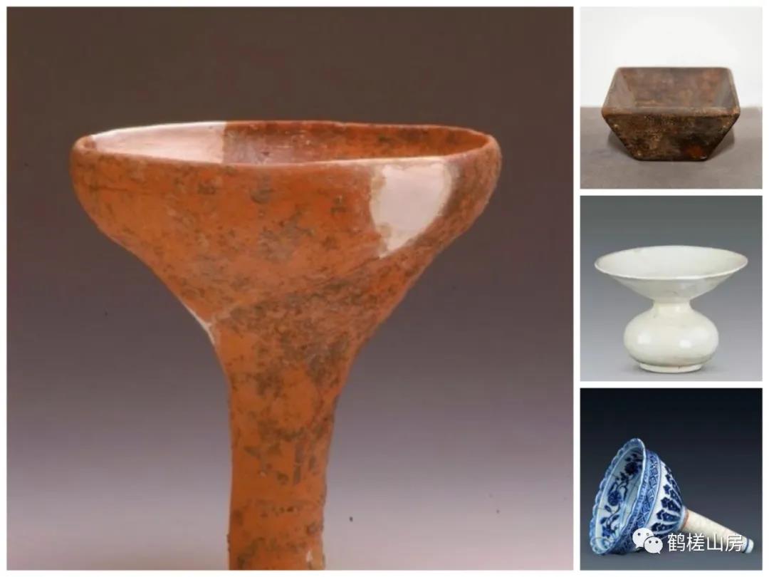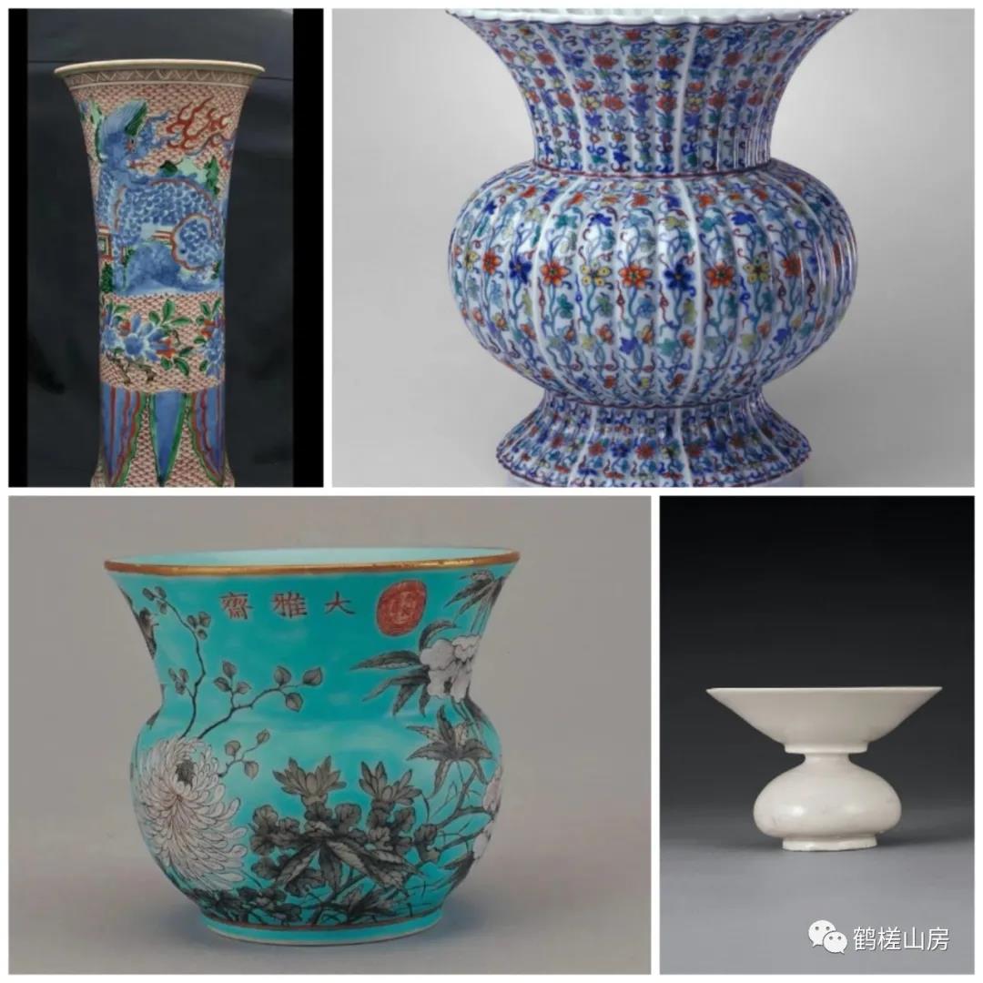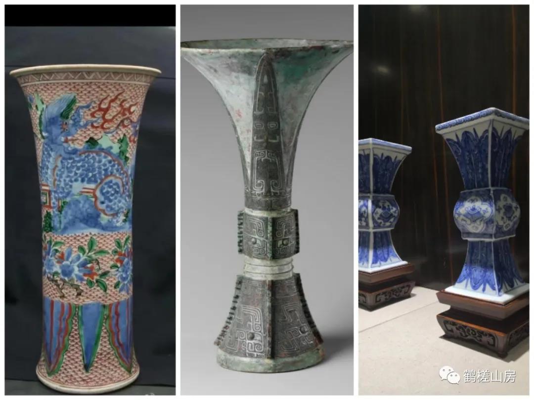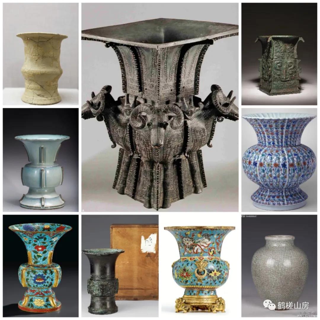 “尊”远古为酒器,《周礼·春宫·小宗伯》:辩六尊之名物,以待祭祀宾客。后演变成陈设之器和祭天礼器。我们可以在博物馆看到很多青铜“尊”,“尊”的形制为圈足、鼓腹(园腹或方腹)、长颈、敞口,宋以后“尊”的出现往往是以陶瓷器的材质出现,频频见于各类绘画题材中,墓葬中作为祭器也屡有发现。再说“觚”,“觚”和“尊”一样,也是一种酒器和礼器,《说文》谓“觚”为乡饮酒之爵也。“觚”高足、细腰、鼓腹(有些没有)、喇叭口,这样的描述和文章中描述的其他器型极端类似,但“觚”的修长身材,相比其他几种还是可以一目了然的,早期材质以青铜为主,明清以后以陶瓷器为主。