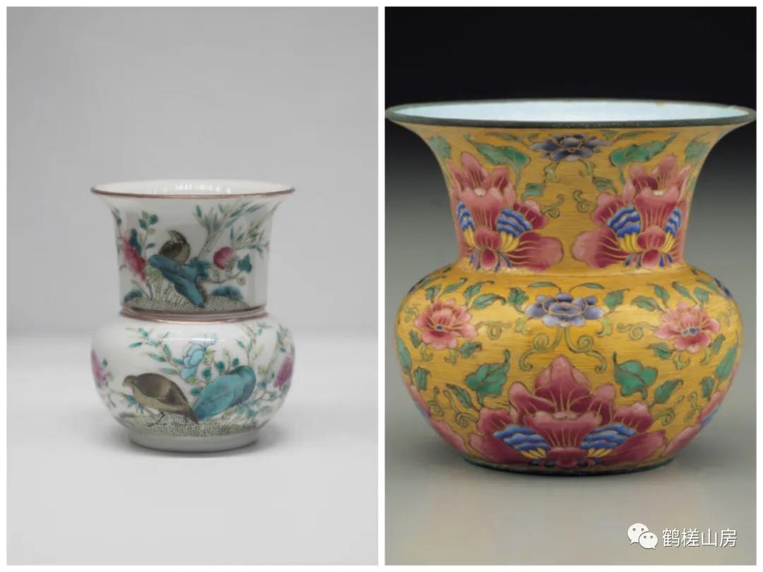 “尊”、“觚”和“渣斗”、“唾盂”器型上有着强烈的天生相似性,它们的功能原来都是盛放和液体(酒)有关联的,但器型相对都有很细微的区别,圈足更容易拿捏。一般来讲“尊”、“觚”都有明显的高圈足。明清以后,“尊”的体态虽然各异,但“觚”的变化却不大,二者明显区别于“渣斗”和“唾盂”。“尊”、“觚”二种器型独立于众多的瓷器器型之中,而“渣斗”和“唾盂”发展到后来却越来越混淆,以至于现在难以说清何谓“渣斗”、哪是“唾盂”?在民国的老先生概念中“渣斗”就是“唾盂”,这显然也是一种讹传。