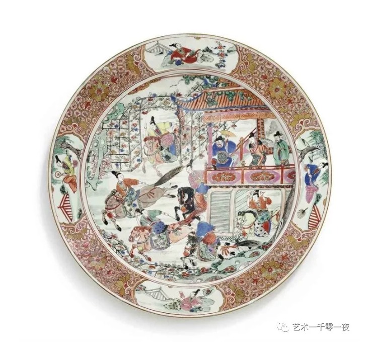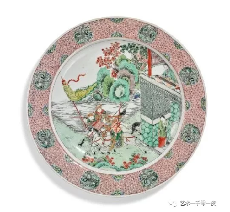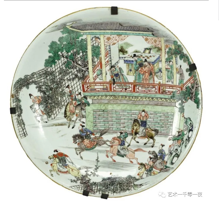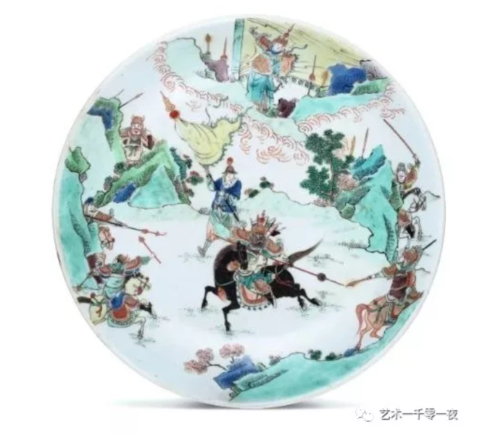 康熙年间外销瓷里的女侠武打场面极为珍贵,其故事有《扬家将》《穆桂英》及《扬门女将》等。如同雍正年间的戏剧故事受到欧洲皇室贵族所喜爱,有《西厢记》《吕布戏貂蝉》等。这里例举的清初出口的外销瓷器上的武打场景,其最为典型的有《水浒传》清山绿水里的梁山好汉,那就是林冲生擒扈三娘了。